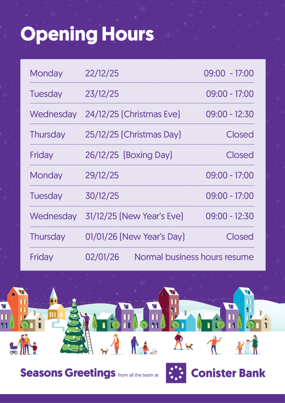 Seasons Greetings from all of us at Conister Bank! Take a look at when we’ll be open over the festive season: